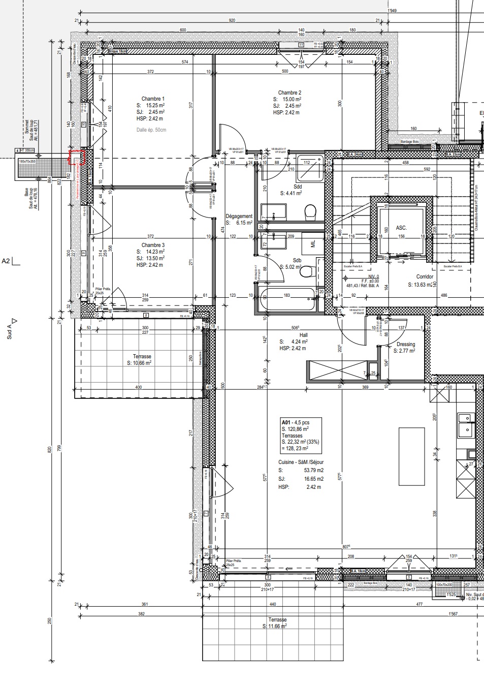 | A01 | Rez | 4.5 | 123.70 m2 | 130.71 m2 | vendu | ||||